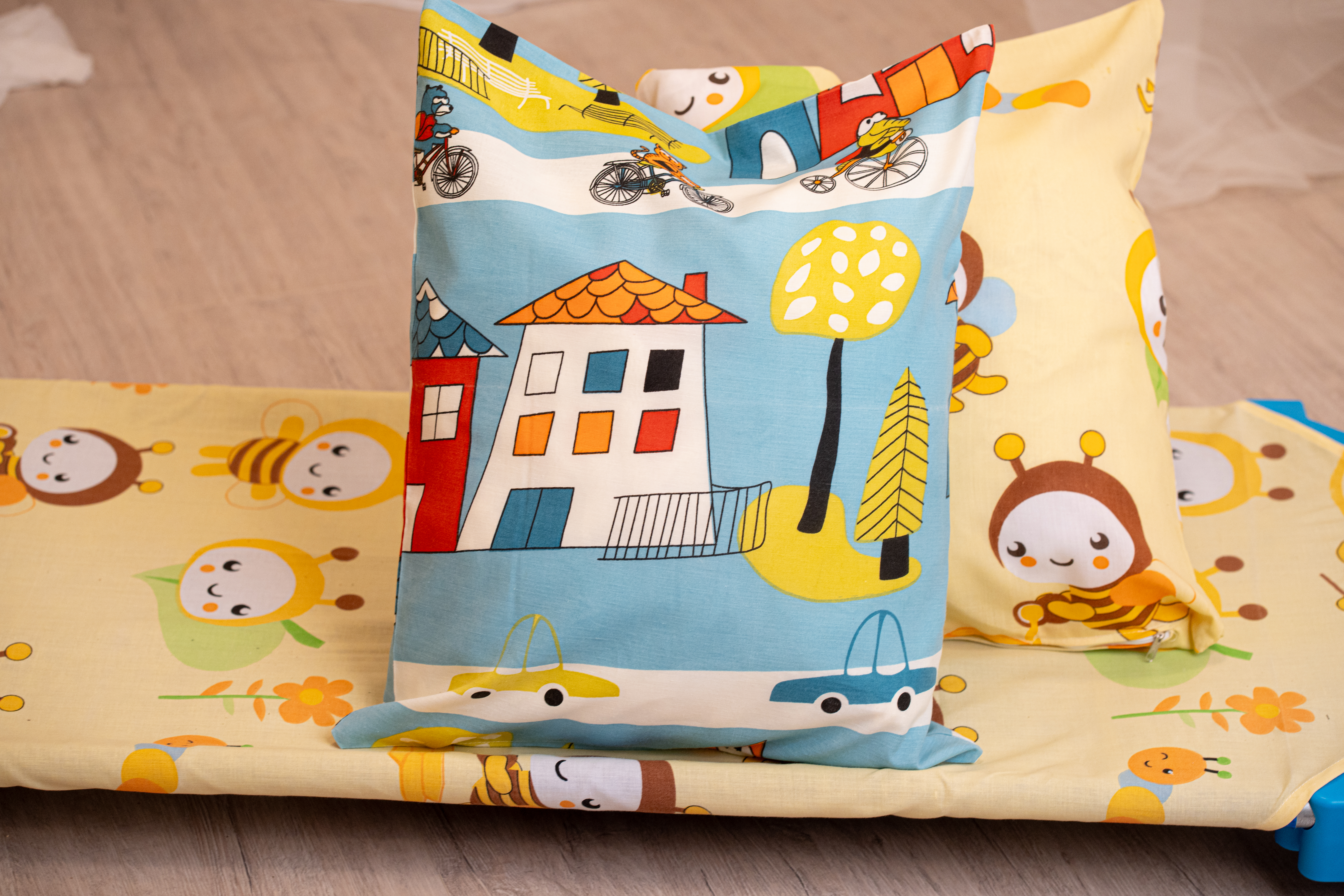 Azonos színű és mintázatú vászonlepedő és ágyneműhuzat választható hozzá, mellyel harmonikus csoportszoba alakítható ki.